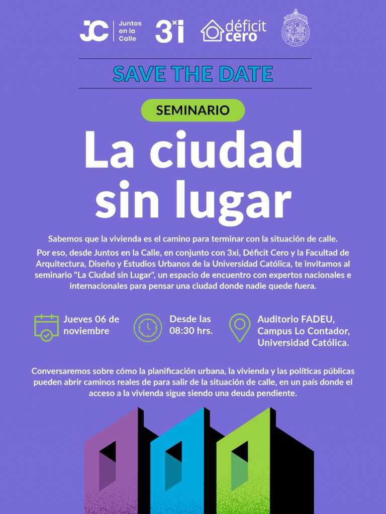 Organizado por Juntos en la Calle, 3xi, Déficit Cero y la Facultad de Arquitectura, Diseño y Estudios Urbanos de la Pontificia Universidad Católica de Chile (FADEU UC), este seminario busca ampliar la mirada sobre la situación de calle en Chile, entendiendo este fenómeno como una expresión de desigualdad urbana y exclusión habitacional.