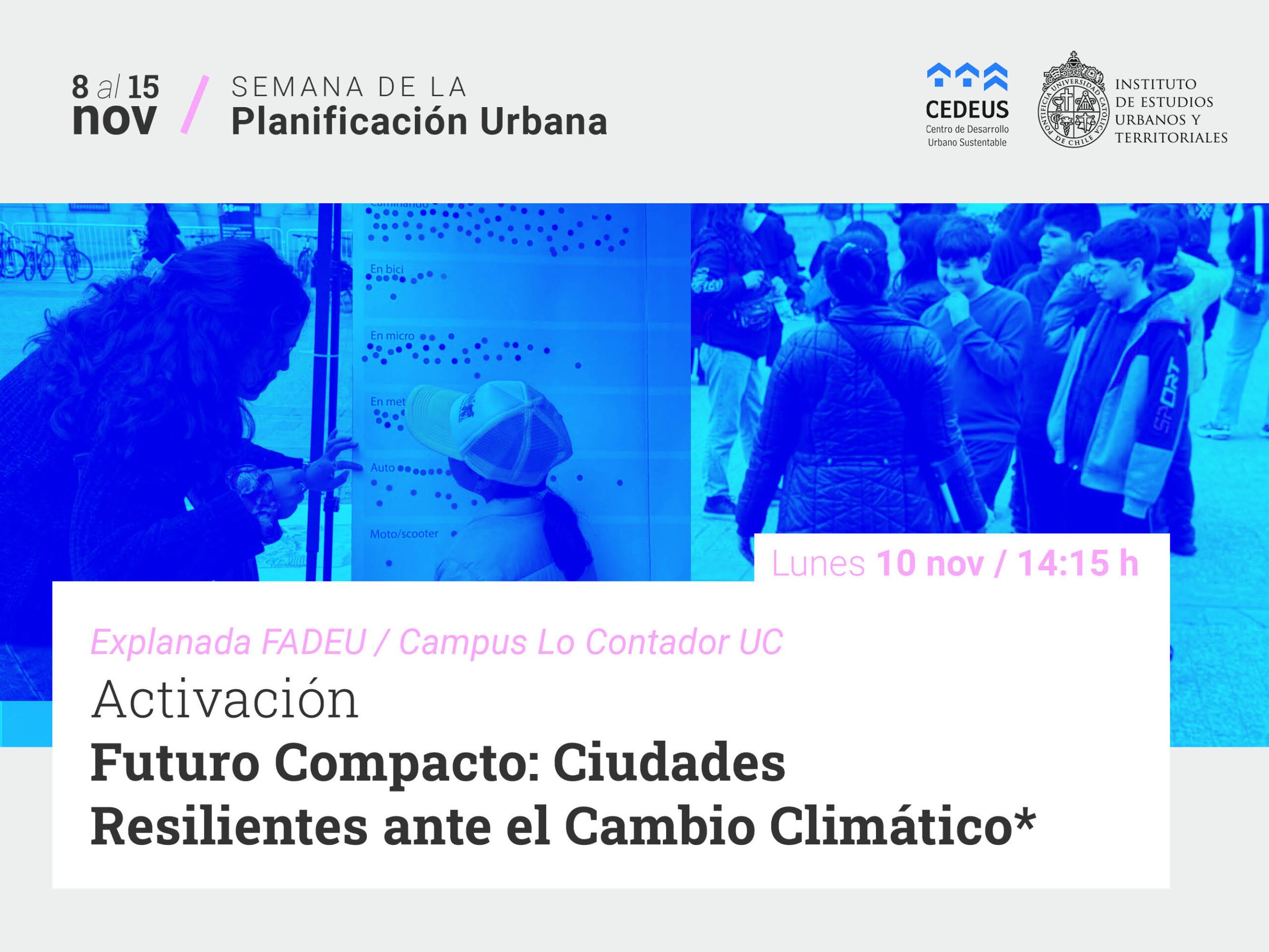 En el marco de la Semana de la Planificación Urbana 2025, la Unidad de Política y Práctica del Centro de Desarrollo Urbano Sustentable (CEDEUS) presenta la intervención “Futuro Compacto: Ciudades Resilientes ante el Cambio Climático”, una experiencia interactiva para explorar los componentes de las ciudades compactas como una alternativa de planificación urbana sustentable y resiliente.