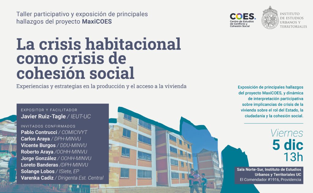 Tenemos el agrado de invitarles al Taller de interpretación participativa, proyecto MaxiCOES “La crisis habitacional como crisis de cohesión social: experiencias y estrategias en la producción y el acceso a la vivienda” a realizarse el viernes 5 de diciembre a las 13h en el Instituto de Estudios Urbanos y Territoriales UC.