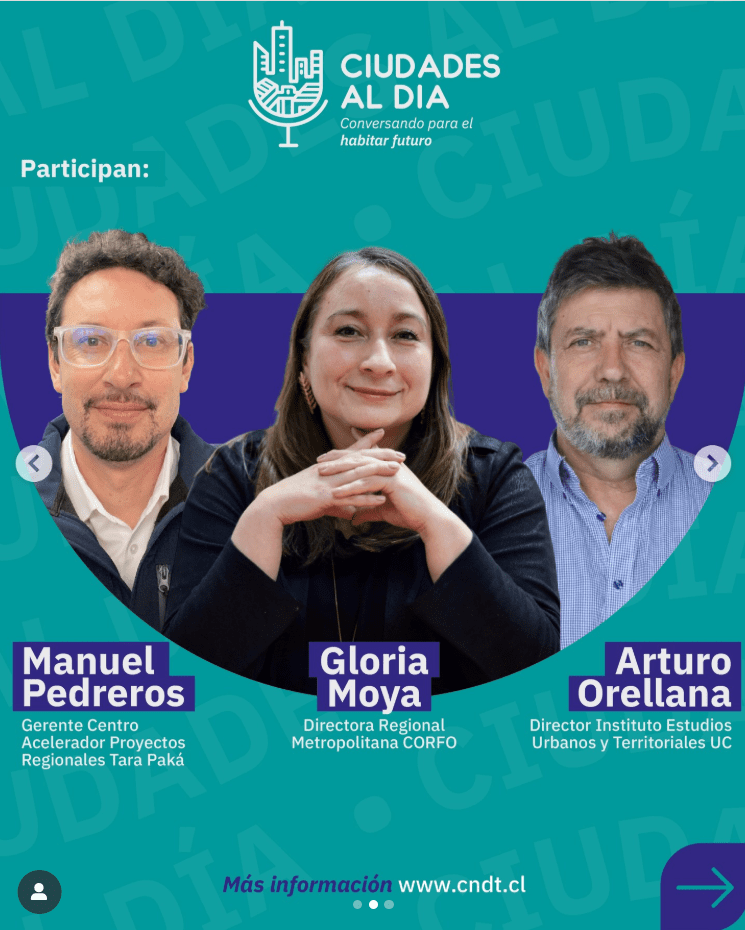 En este capítulo de cierre, dedicado al desarrollo económico urbano, participaron también Gloria Moya, directora regional de Corfo Metropolitano, y Manuel Pedreros, gerente del Centro Acelerador de Proyectos Regionales Tarapacá. Ambos compartieron experiencias y estrategias concretas para potenciar la productividad, fomentar la innovación y fortalecer la sostenibilidad territorial, mostrando cómo distintos actores públicos y privados pueden articularse para generar impactos positivos en las ciudades y regiones de Chile.