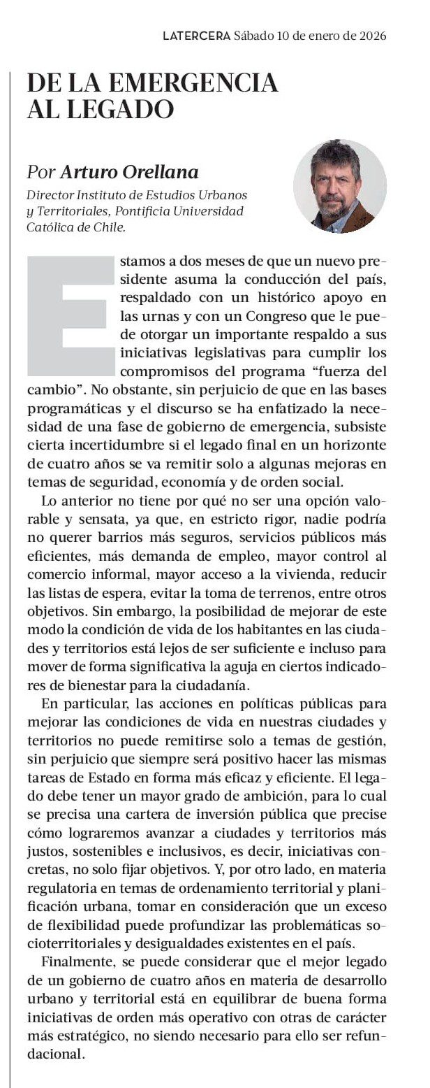 Cuando avanza la cuenta regresiva para el cambio de mando, el próximo 11 de marzo, y se asoman nombres de quiénes conformarán el gabinete del presidente electo José Antonio Kast, Arturo Orellana, director del Instituto de Estudios Urbanos y Territoriales UC, compartió sus impresiones respecto del foco que ameritan las ciudades y territorios nacionales, en vista de una mejor calidad de vida para sus habitantes.