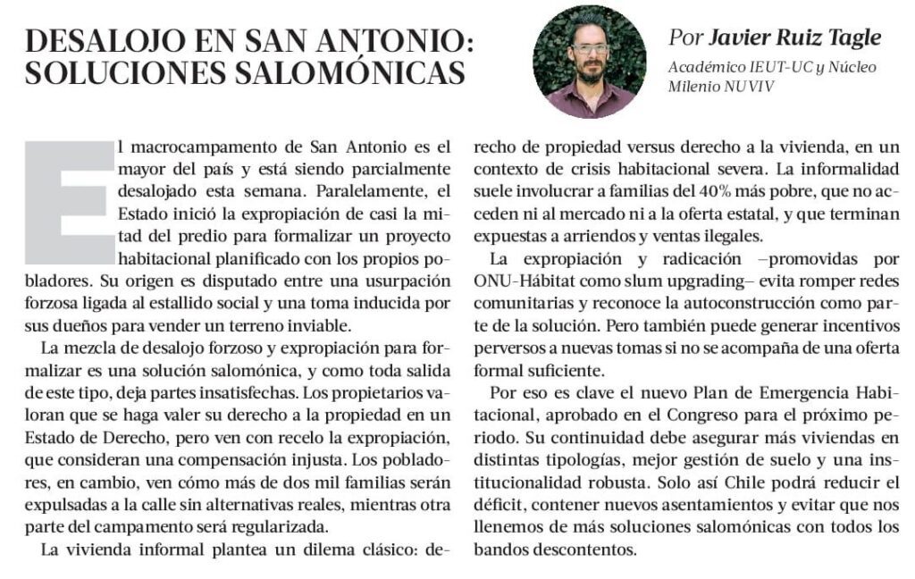 El académico del IEUT UC y del Núcleo Milenio NUVIV analiza el desalojo parcial del mayor macro-campamento del país. Ruiz-Tagle aborda el dilema entre derecho de propiedad y derecho a la vivienda en contexto de crisis habitacional. «La mezcla de desalojo forzoso y expropiación para formalizar es una solución salomónica, y como toda salida de este tipo, deja partes insatisfechas», escribe en su columna publicada en LT el 17 de enero.