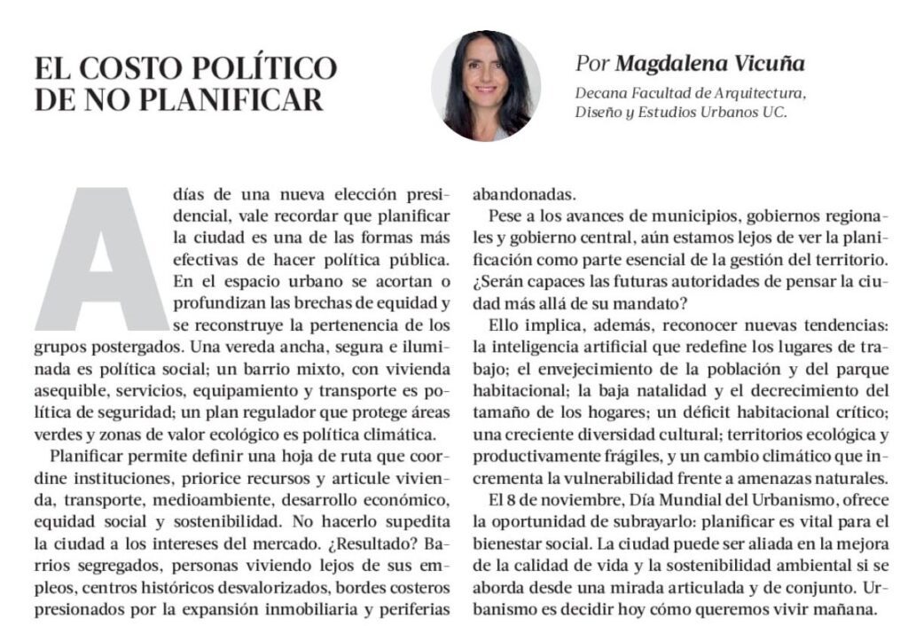 En el marco del Día Mundial del Urbanismo, la decana de la Facultad de Arquitectura, Diseño y Estudios Urbanos UC, Magdalena Vicuña, publica en La Tercera la columna “El costo político de no planificar”, donde plantea una reflexión clave para el debate público: la ciudad es uno de los principales escenarios donde se juega la equidad, la sostenibilidad y la calidad de vida. Vicuña advierte que, sin una planificación que articule vivienda, transporte, infraestructura, medioambiente y desarrollo social, las ciudades quedan entregadas a dinámicas de mercado que profundizan la segregación y el deterioro territorial. Frente a nuevas tendencias —como el envejecimiento de la población, la baja natalidad, la inteligencia artificial o la crisis climática—, la autora enfatiza que planificar no es solo ordenar el territorio, sino anticipar el mañana. Te invitamos a leer la columna completa a continuación.