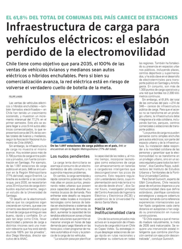 En la crónica firmada por Felipe Lagos se lee que, aunque la comercialización avanza, con un crecimiento sostenido que registra un aumento interanual del 77,2% en el primer semestre, y este 2025 se espera llegar a 9 mil autos eléctricos comercializados, la infraestructura de carga está al debe.
