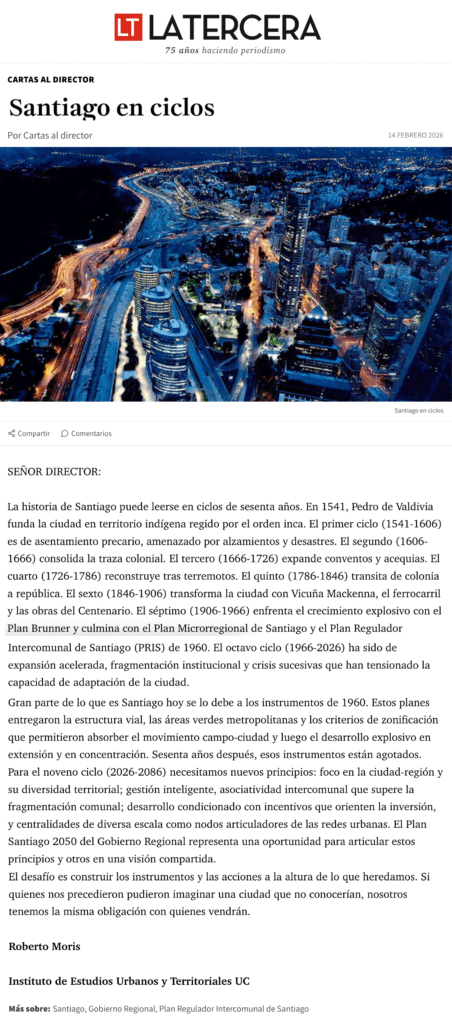 En cartas al director de La Tercera , el académico del IEUT UC propone una lectura histórica de la capital basada en períodos de seis décadas y plantea lineamientos para su planificación futura.