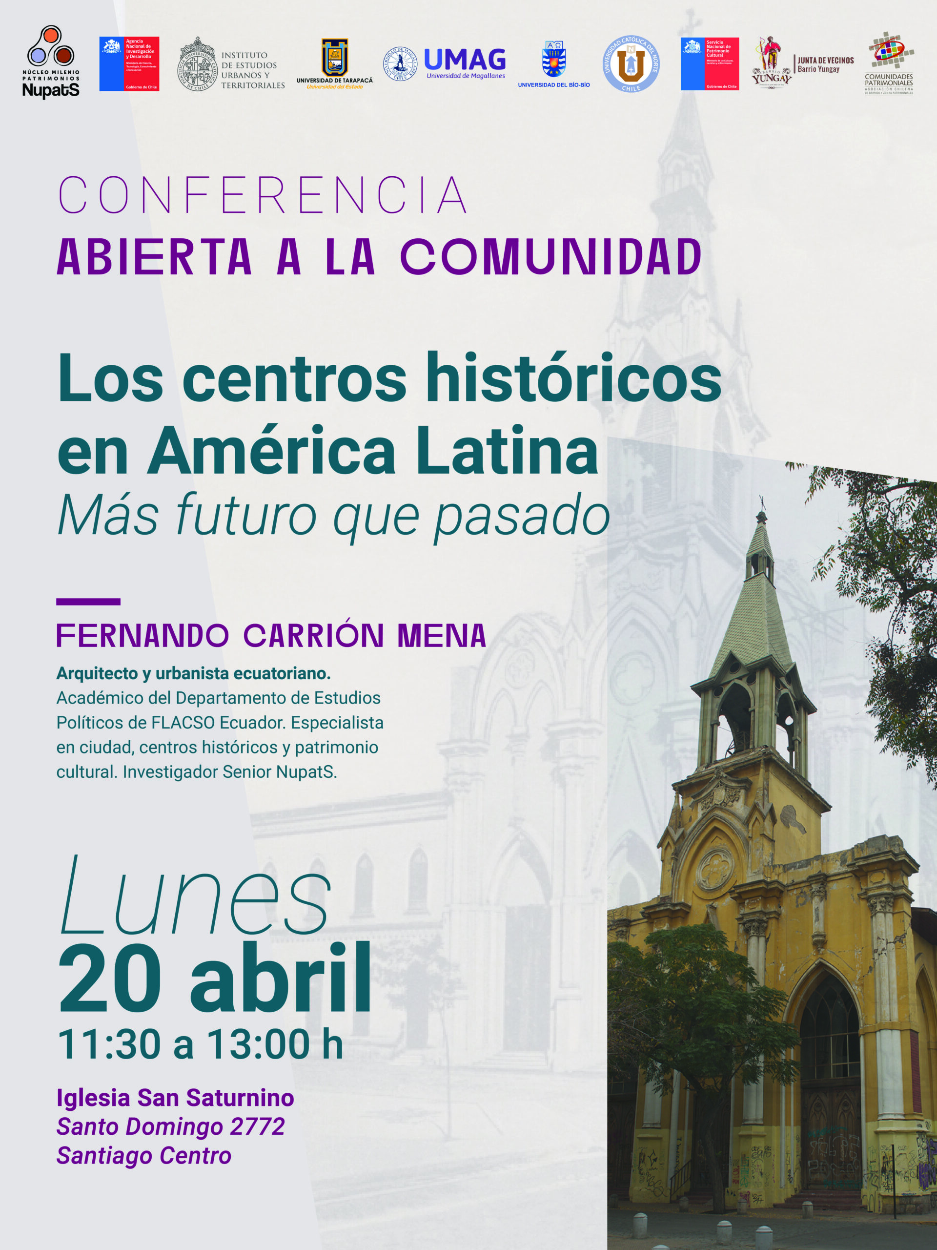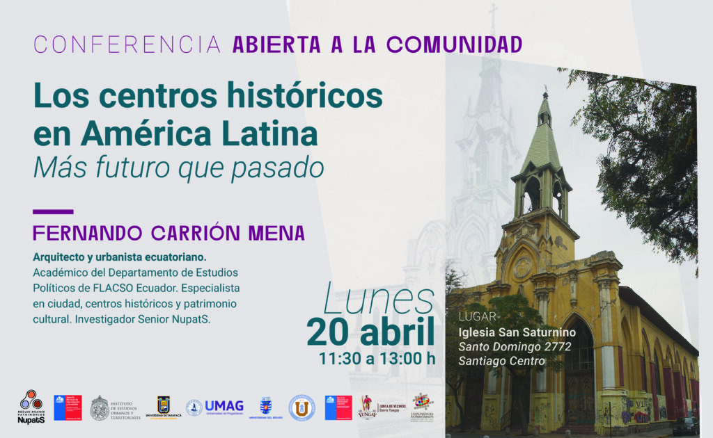 El Instituto de Estudios Urbanos y Territoriales UC invita a la comunidad a participar en esta conferencia del destacado arquitecto y urbanista Fernando Carrión, referente latinoamericano en estudios sobre ciudad, patrimonio y centros históricos. La actividad propone reflexionar sobre el rol de estos espacios como territorios vivos, en constante transformación y con proyección de futuro, abordando sus desafíos en términos de gestión, memoria y vida cotidiana. La cita es el lunes 20 de abril, entre 11:30 y 13:00 hrs, en la Iglesia de San Saturnino, Barrio Yungay. Actividad presencial y abierta a todo público.