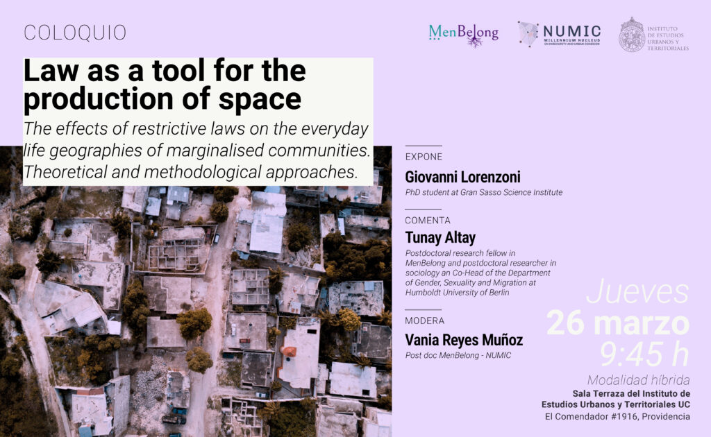En el marco del Núcleo Milenio en Inseguridad y Cohesión Urbana (NUMIC), esta actividad propone reflexionar sobre cómo las regulaciones legales influyen en la configuración del espacio y en las geografías cotidianas de comunidades marginadas. Giovanni Lorenzoni (Gran Sasso Science Institute) presentará su investigación doctoral, seguida por los comentarios del Dr. Tunay Altay (Humboldt University of Berlin). La sesión finalizará con un espacio abierto de conversación con las y los asistentes, promoviendo el intercambio académico interdisciplinario.