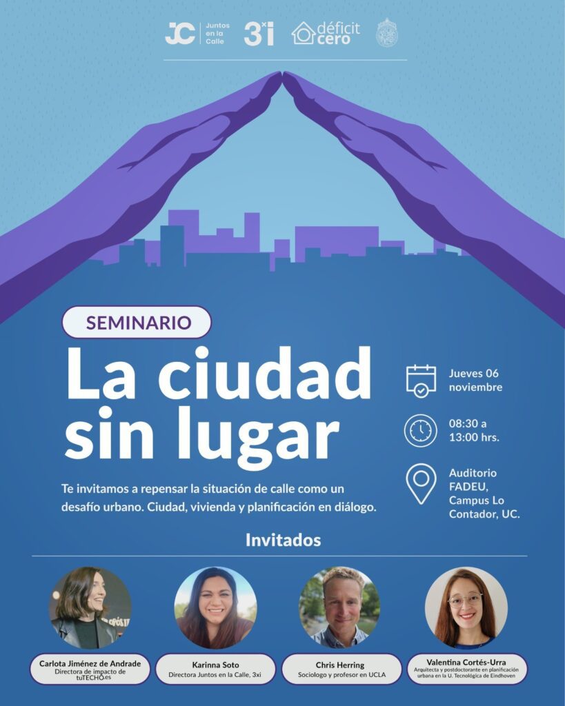 Organizado por Juntos en la Calle, 3xi, FADEU UC y Déficit Cero, este seminario invita a reflexionar sobre cómo la situación de calle refleja un modelo urbano que excluye y divide, y a explorar oportunidades para pensar en ciudades y comunidades más abiertas e inclusivas.