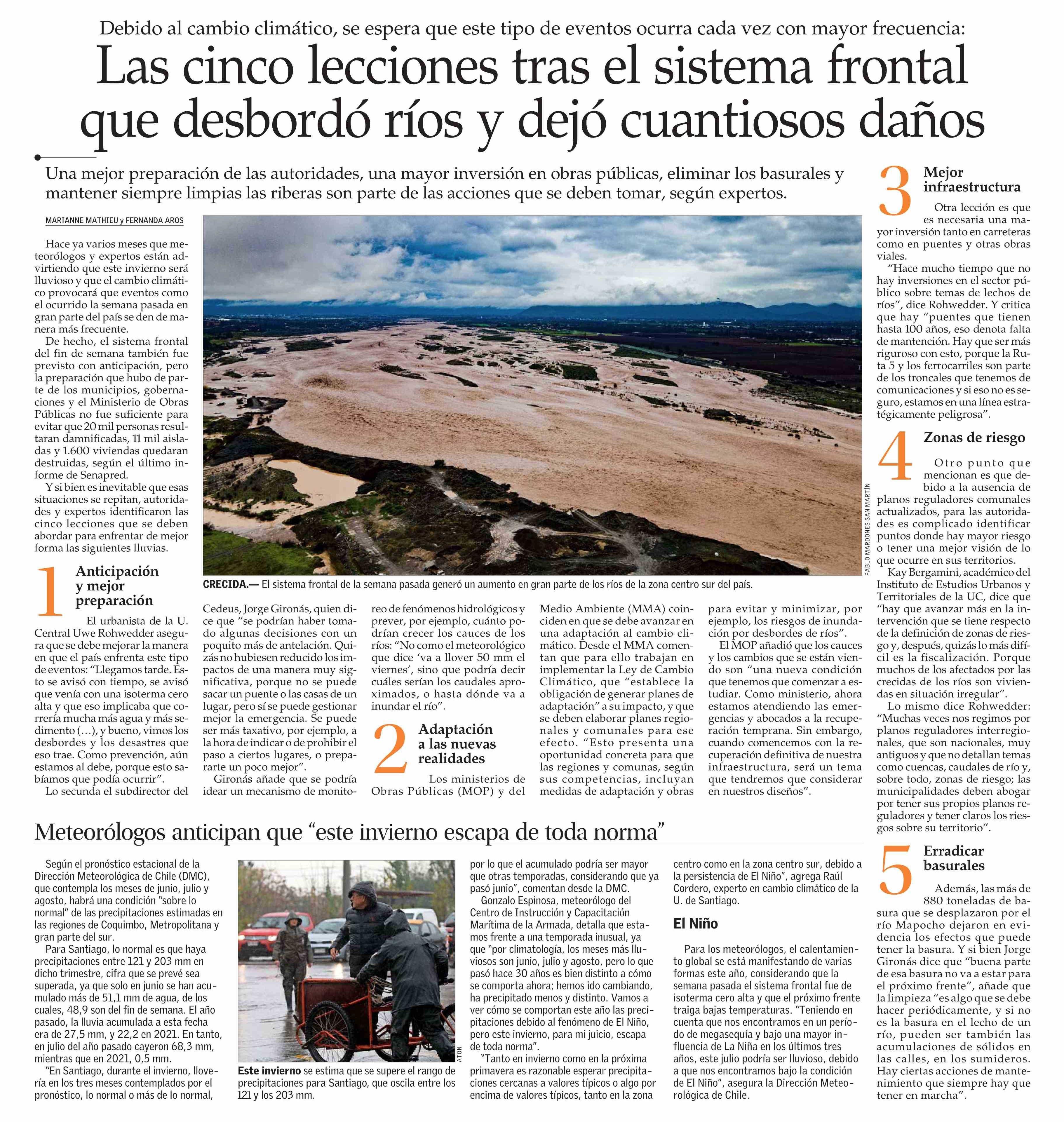 El Mercurio destaca las cinco lecciones tras el sistema frontal que desbordó ríos y dejó cuantiosos daños. Habla el académico Kay Bergamini y el subdirector del Cedeus, Jorge Gironás.