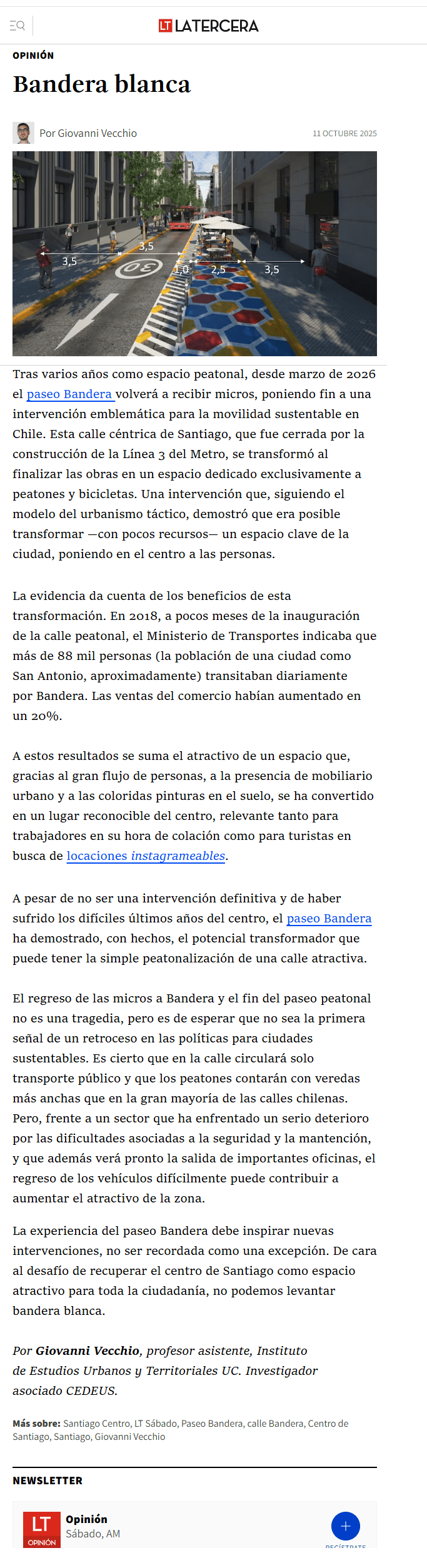 El anuncio ha generado una nutrida discusión a través de las redes sociales, artículos en medios escritos y cartas y columnas firmadas por arquitectos, urbanistas, entre otros. Giovanni Vecchio, profesor asistente del Instituto de Estudios Urbanos y Territoriales UC e investigador asociado del CEDEUS, no se restó y el pasado 11 de octubre publicó la columna “Bandera blanca”. Allí dice que “el regreso de las micros a Bandera y el fin del paseo peatonal no es una tragedia, pero es de esperar que no sea la primera señal de un retroceso en las políticas para ciudades sustentables”.