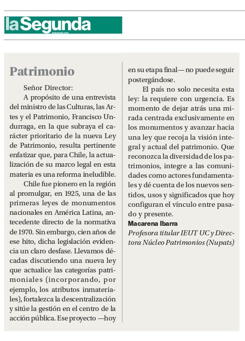 El pasado 30 de marzo, La Segunda publicó una carta de la académica del IEUT UC y directora de NupatS, Macarena Ibarra, en la que aborda la necesidad de avanzar en la Nueva Ley de Patrimonio. En su reflexión, pone énfasis en la urgencia de actualizar el marco normativo vigente y de impulsar un cambio de enfoque que releve la descentralización y amplíe la comprensión del patrimonio.