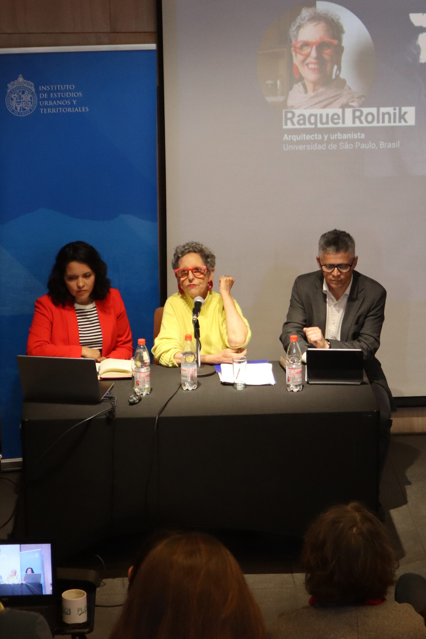 La visita de Rolnik se enmarca en una colaboración de largo plazo con investigadores del IEUT UC, entre ellos Luis Fuentes, Felipe Link y Adriana Marín, quienes continúan estudiando los actores, prácticas e impactos de la financiarización de la vivienda en Chile a través del proyecto Fondecyt ditigido por el profesor Fuentes.