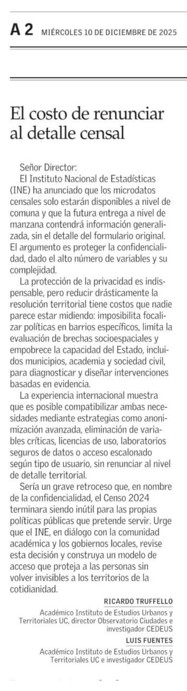 En una carta publicada hoy en El Mercurio, Ricardo Truffello y Luis Fuentes alertan sobre los impactos que tendrá limitar el acceso a microdatos censales a nivel de manzana y llaman al INE a revisar su decisión en diálogo con la academia y los gobiernos locales.