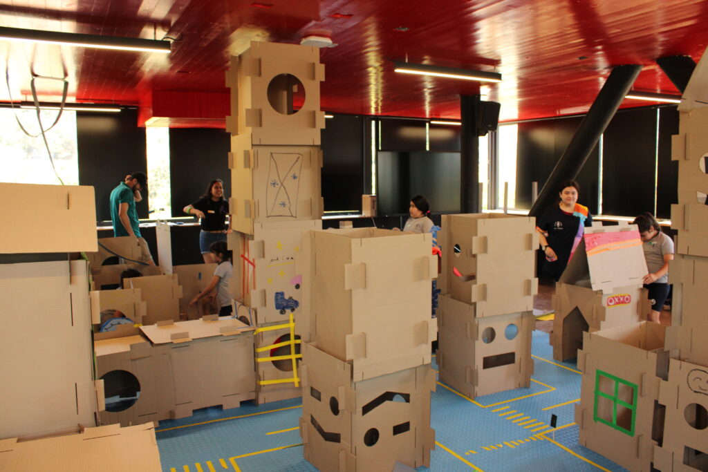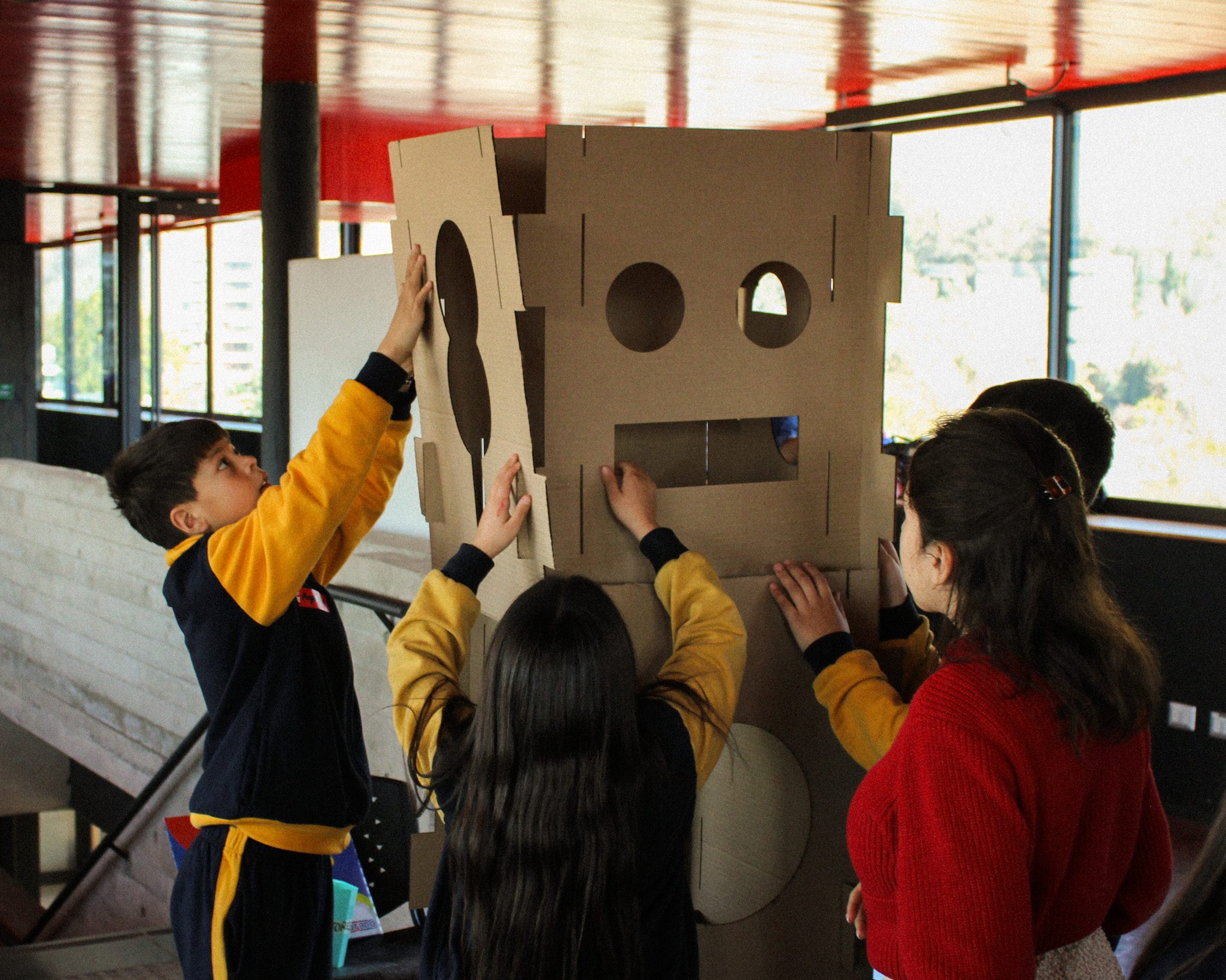 Visita a Campus Lo Contador: Finalmente las y los estudiantes junto a sus profesoras y equipo de Ruteando, visitaron el Campus Lo Contador, donde desarrollaron la ciudad de sus sueños con materiales modulares de cartón, en la Sala Terraza del IEUT UC.